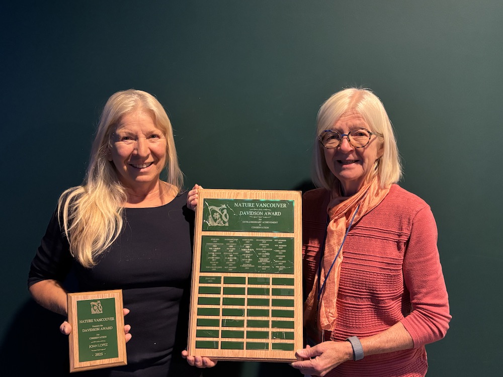 On behalf of the MBS team, myself, Carolyn, Jennifer, Deborah, Naomi and Niamb, we are delighted to offer this Davidson Conservation award to such a deserving person. The Davidson Award was established in 1993 in honour of Society founder Professor John Davidson, a vocal conservation advocate. Thank you, Joan, for all your support and service to Nature Vancouver!!