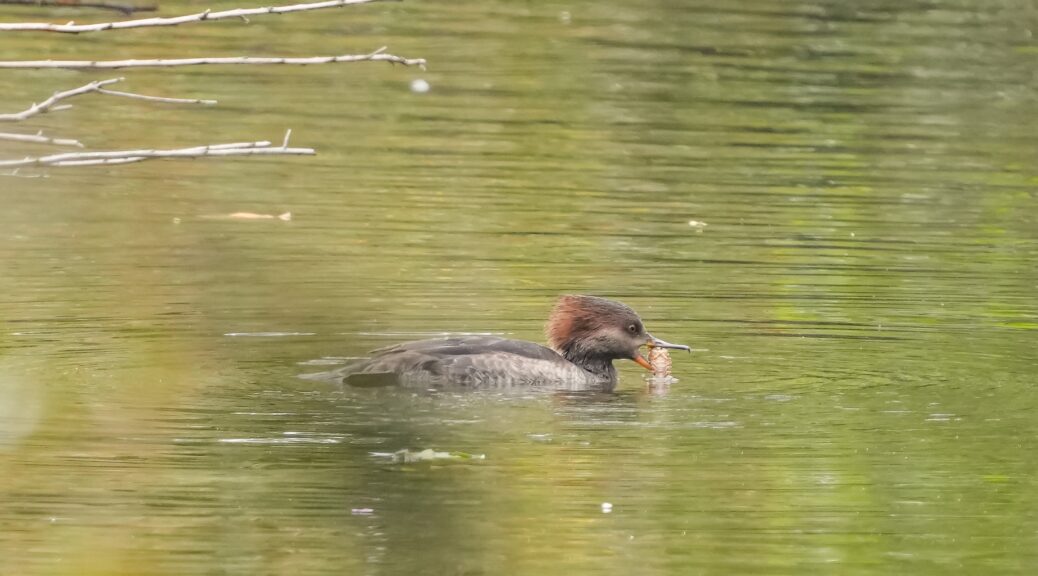 After about an hour enjoying the birds from the boardwalk we turned to the forest paths to look for passerines. We were immediately greeted by Black-capped Chickadees using their ‘chick-a-dee-dee-deee’ call to warn everyone of our approach! As we walked further we spotted Purple Finches and Goldfinches in a Pacific Crab Tree, Spotted Towhees and Song Sparrows in the shrubbery, and several raucous Steller’s Jays in the treetops. But the morning was grey and the birds were fairly shy, so as we walked the paths east of Piper Spit we had time to admire beetles, Banana Slugs, and a few Pacific Chorus Frogs too. As we looped back towards our starting point the birding picked up with the appearance of some American Robins, a Northern Flicker, a few Anna’s Hummingbirds, and a male Belted Kingfisher. We even got a chance to watch a group of Steller’s Jays picking acorns from an oak tree before finishing with one last new bird — a Hooded Merganser who we watched catch and eat a small fish.